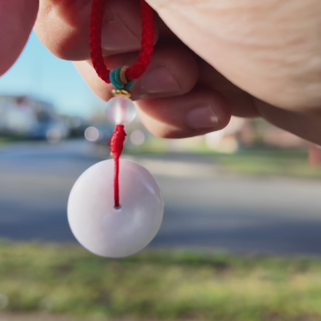 This pendant features a hand-polished jadeite donut (Ping An Kou) carved from natural lavender jadeite jade. The soft, milky lavender tone carries a quiet translucency, creating a gentle presence that feels both modern and timeless.